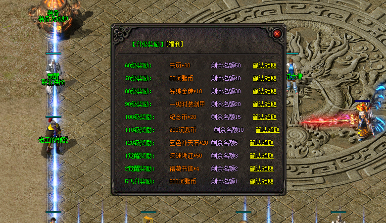 在 60 级到 120 级每升 10 级,以及达成 1 觉醒、2 觉醒、5 飞升阶段,可分别领取书页、沉默币、洗练金牌、一级时装剑甲、纪念币、五色补天