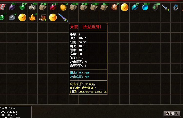 永久属性:攻魔道 10-10、2% 暴击、杀怪爆率 + 30%