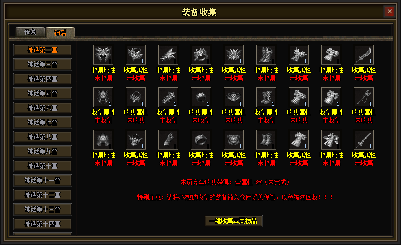 多余的“传说”和“神话”装备可以收集获得属性,控制台右下角“收集”。