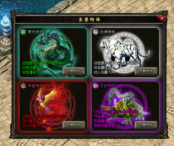 6.圣兽附体每种圣兽都有不一样的属性在不同的场合自行切换只能存在一种!