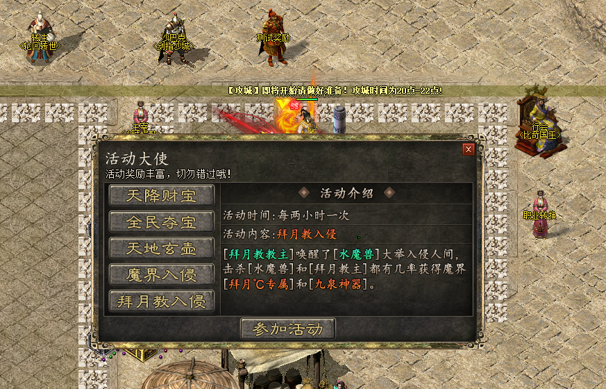 5:拜月教入侵(必参加)根据系统提示参加即可,产出邪神套,拜月专属,九泉神器!!!